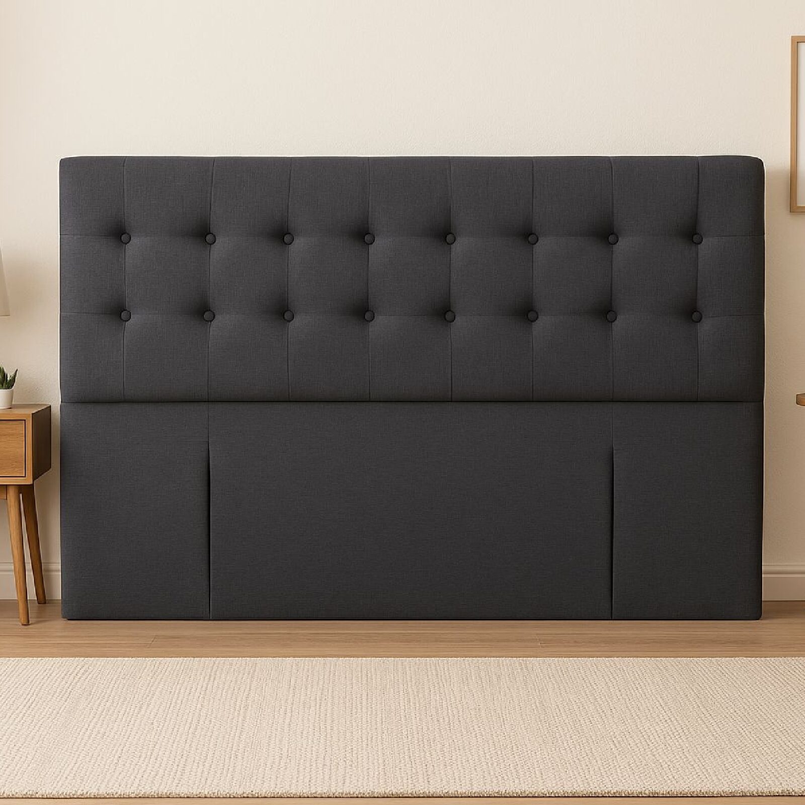 Elevate your bedroom with the timeless style and plush comfort of our Deep-Buttoned Fabric Headboard. Upholstered in a durable, textured charcoal grey linen-look fabric, this bedhead offers a sophisticated focal point for any room. The classic tufted design features two rows of evenly spaced buttons, creating a luxurious, inviting look that is both modern and traditional.