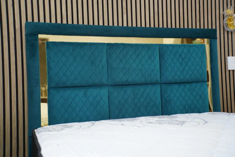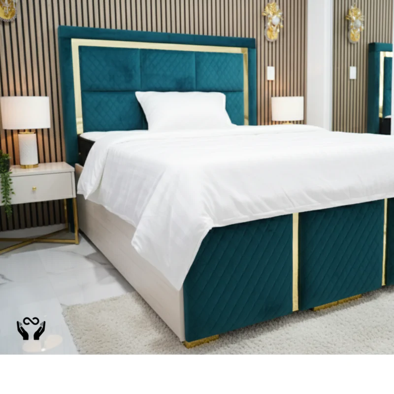Turn your bedroom into a modern luxury suite with our Quilted Velvet Upholstered Bed, designed to impress from every angle. Wrapped in rich, deep teal velvet with a diamond-quilted finish, this bed exudes opulence while delivering exceptional comfort and support. The oversized paneled headboard is framed with sleek gold trim, creating a bold visual statement that feels both regal and refined.